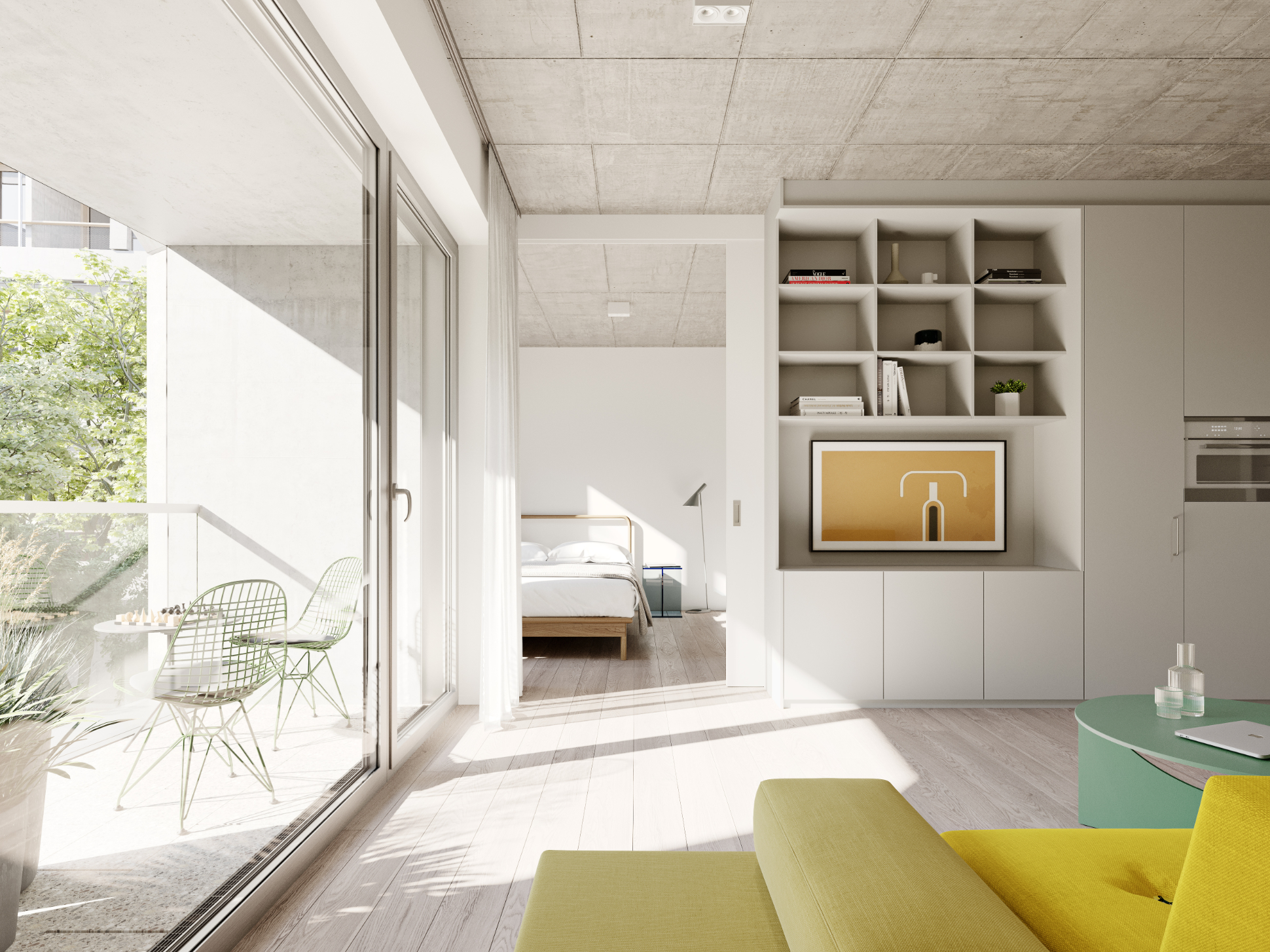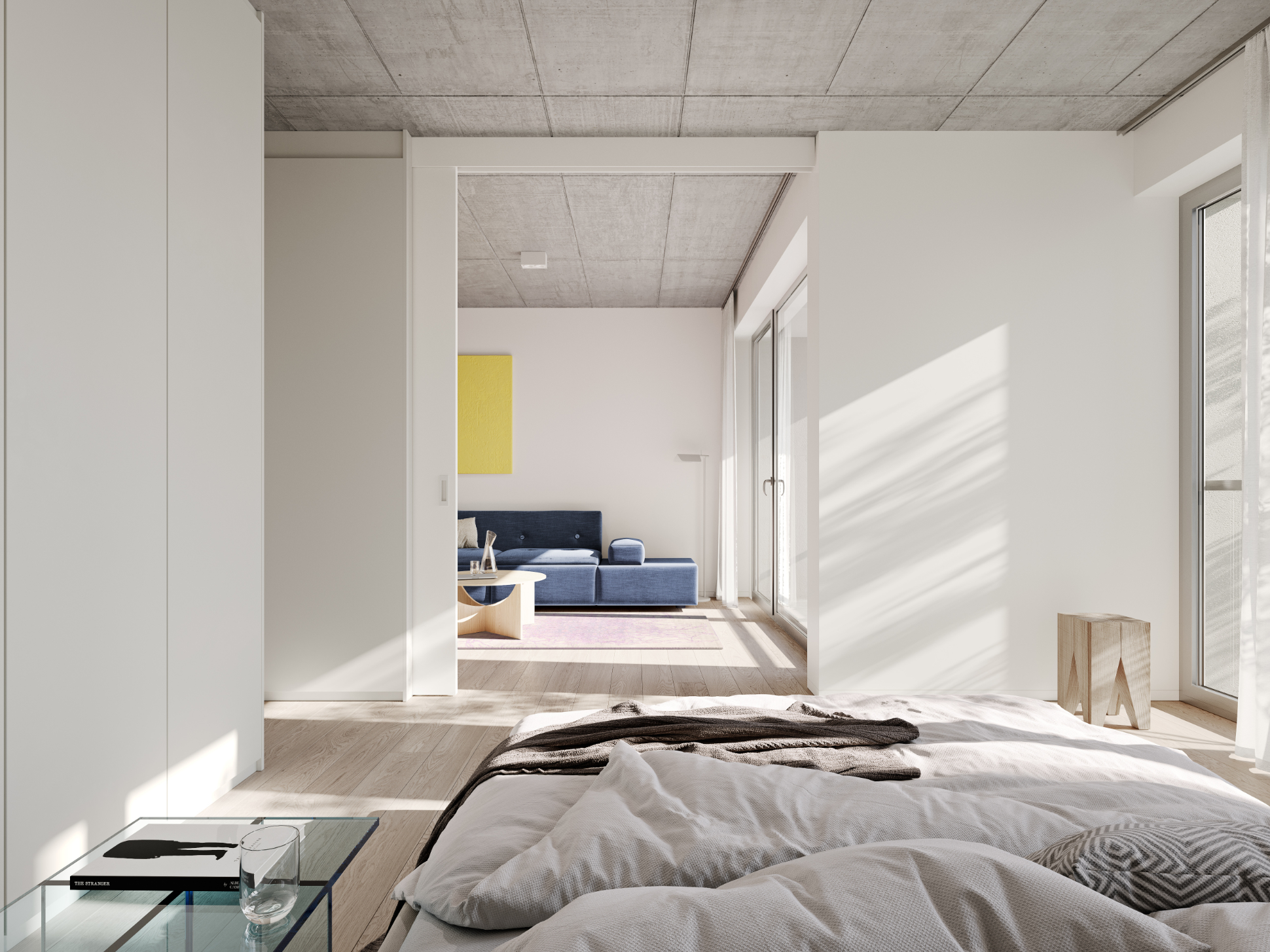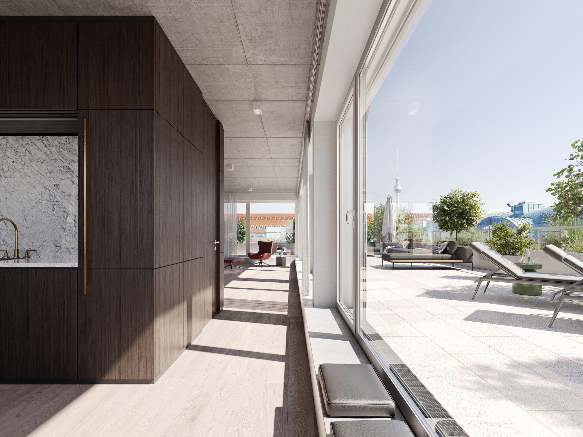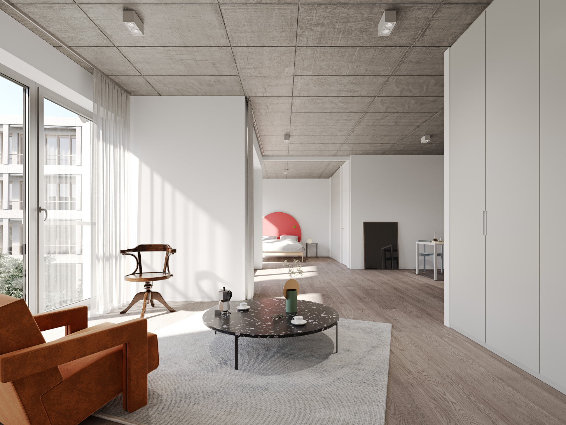 In close cooperation with Grüntuch Ernst Architects, we designed a picture package that reflects the characteristic architecture and material language of the development. Minimalist furnishings and targeted interior design accents reflect the target group and architectural specifications.