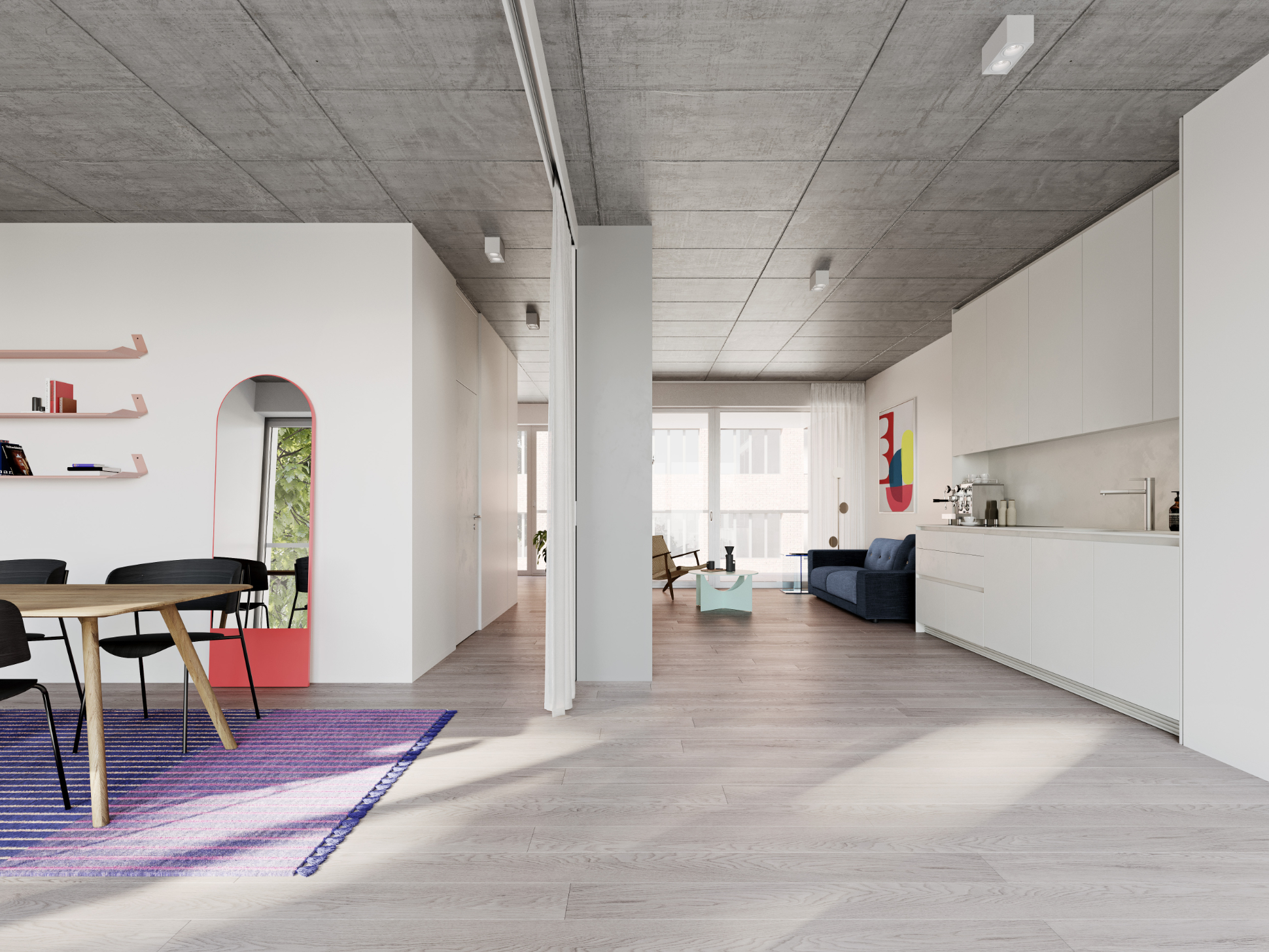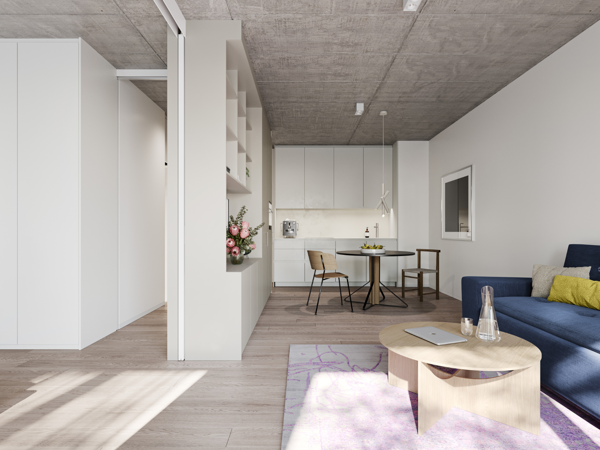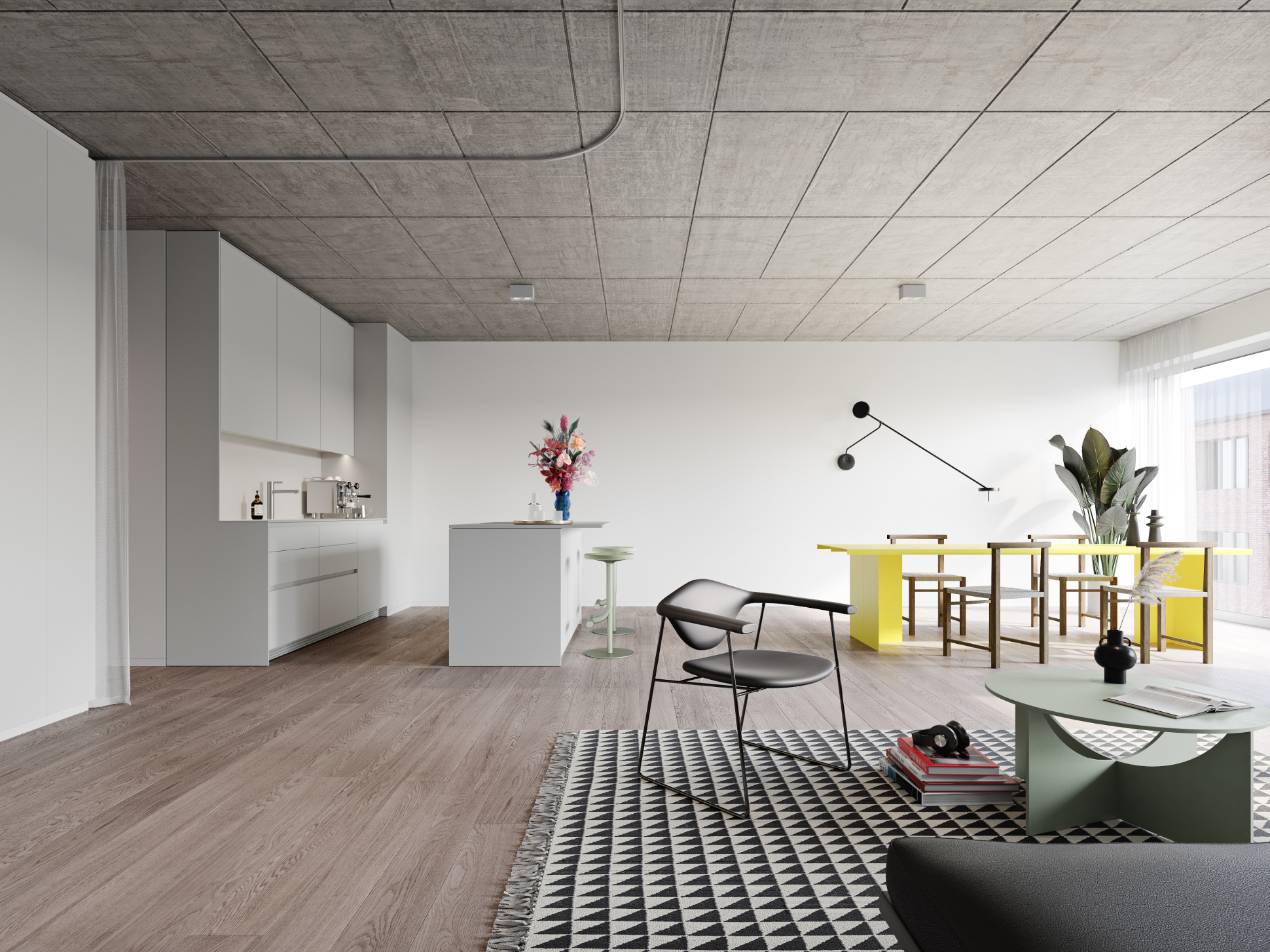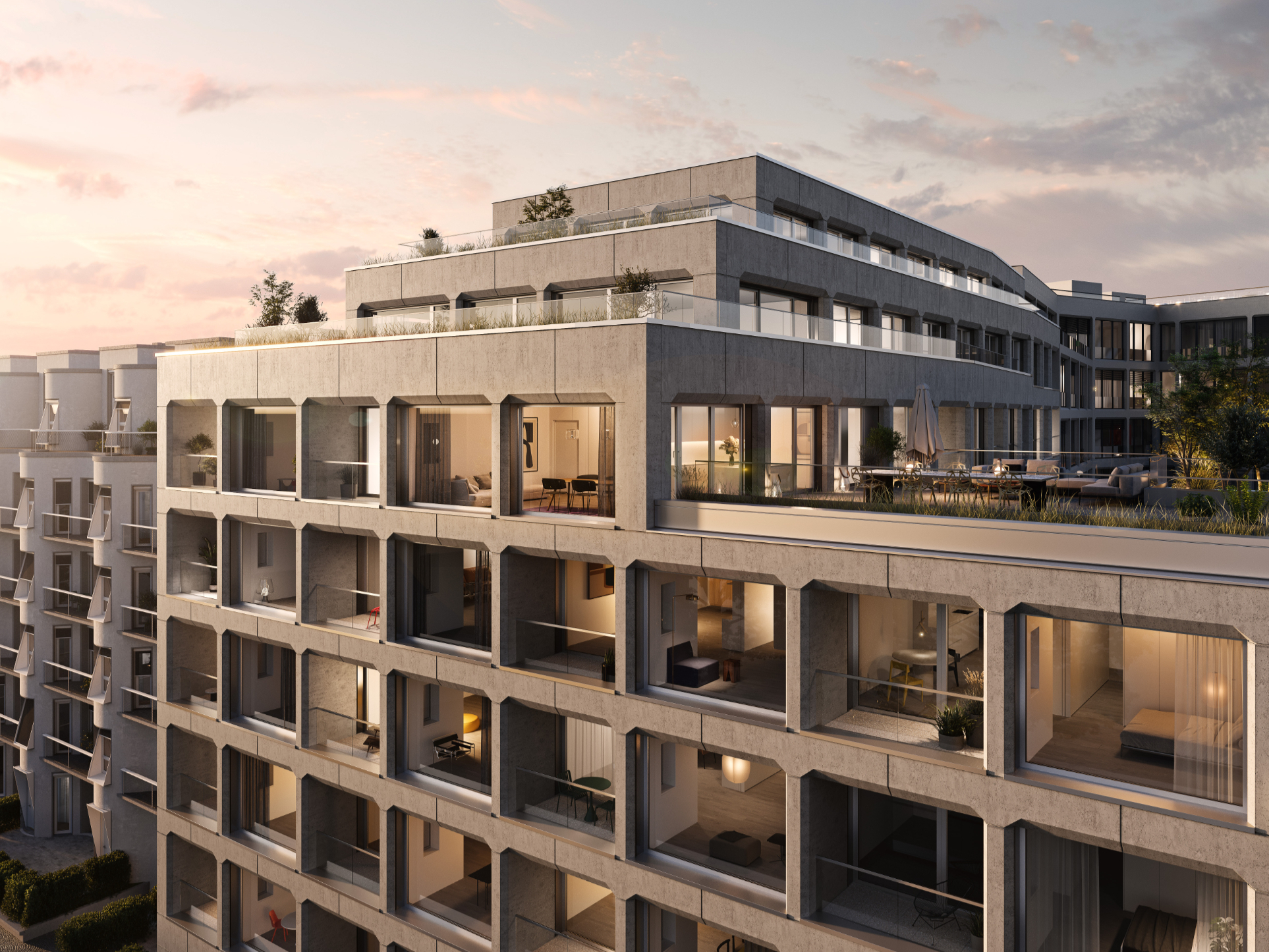 In close cooperation with Grüntuch Ernst Architects, we designed a picture package that reflects the characteristic architecture and material language of the development. Minimalist furnishings and targeted interior design accents reflect the target group and architectural specifications.