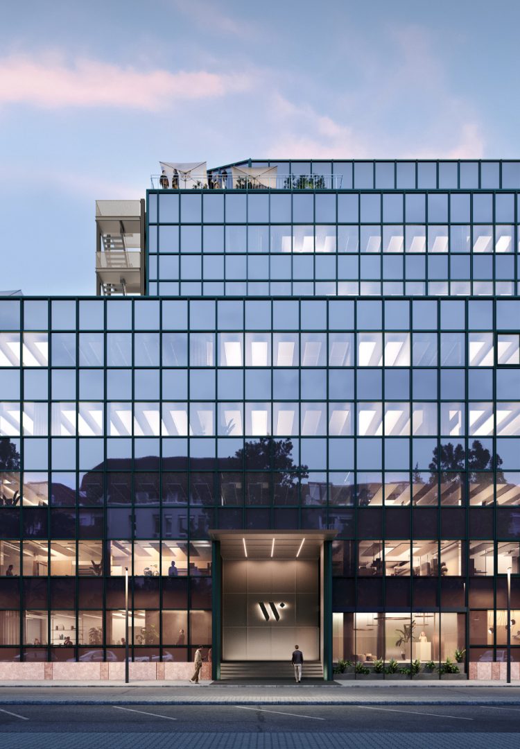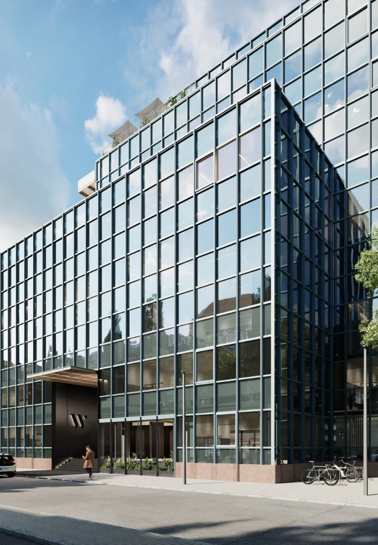 The project is about an existing office building, which is undergoing extensive renovation. In the design, aluminum and natural stone are retained. The striking mullion, the transom facade made of glass, and newly designed spacious entrance areas open up the building.