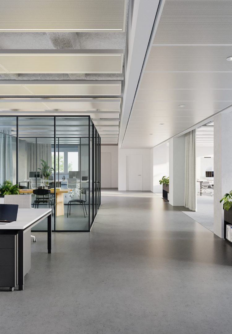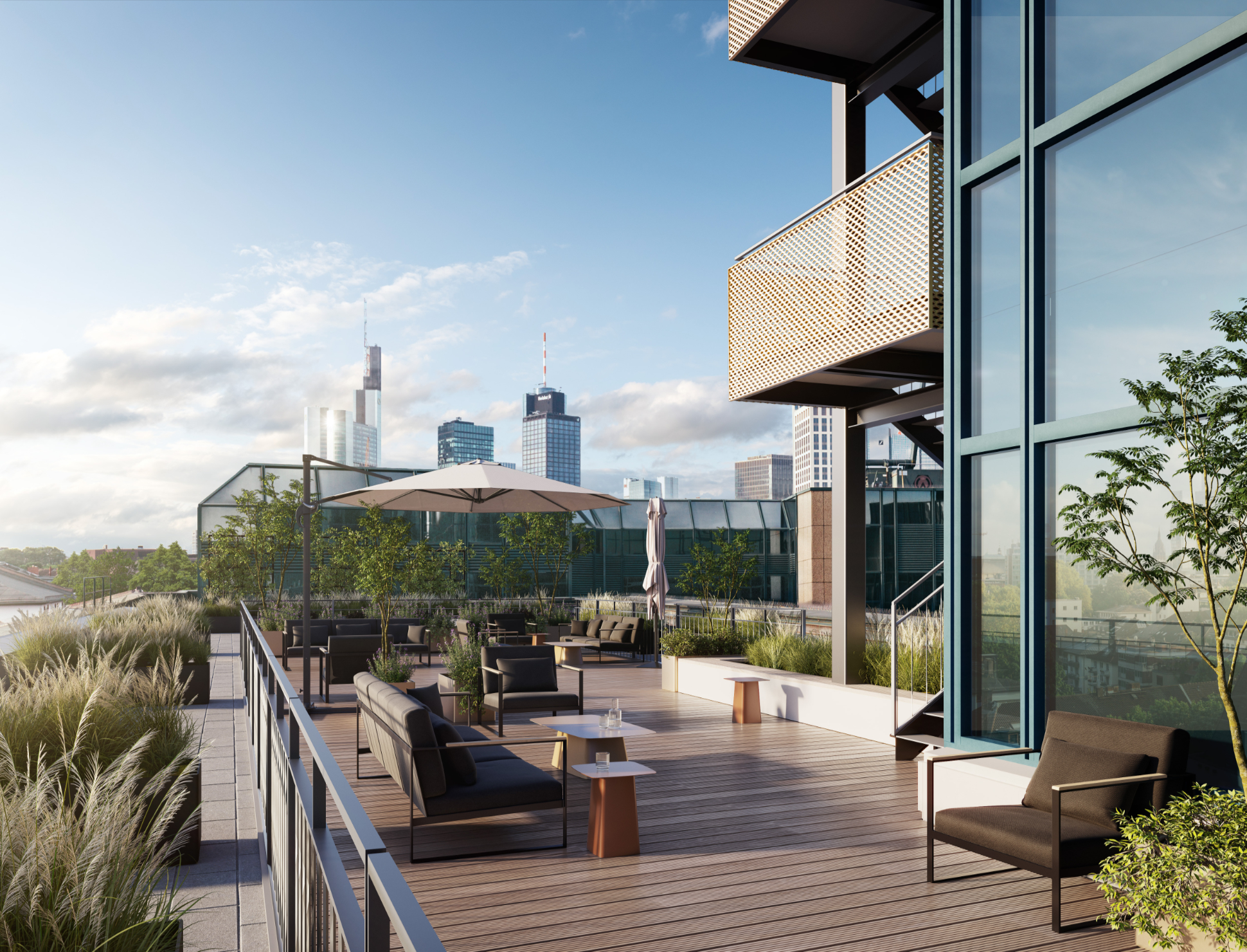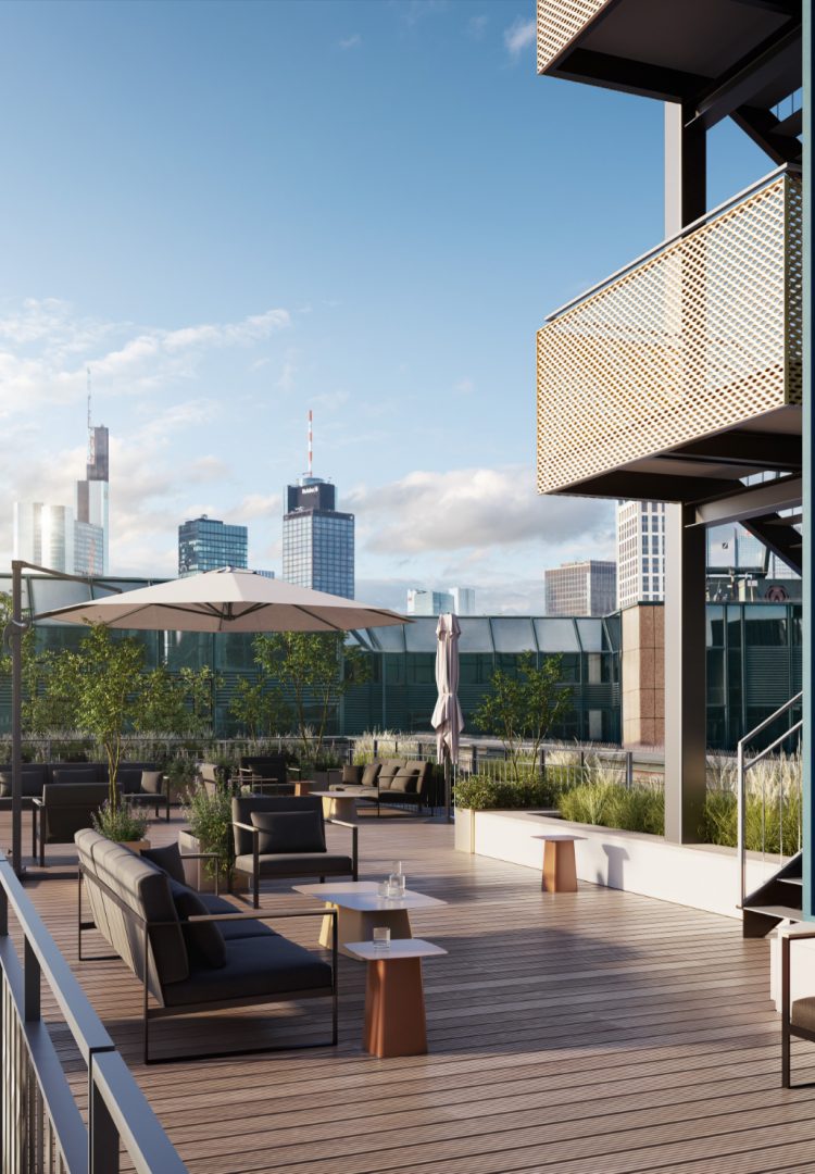 All office space is being completely redesigned and, after the conversion, offers space for individual and innovative room concepts – from individual or group offices aswell as open space. Newly designed inner courtyards, green areas and roof terraces with a view of the skyline complete the renovation concept.