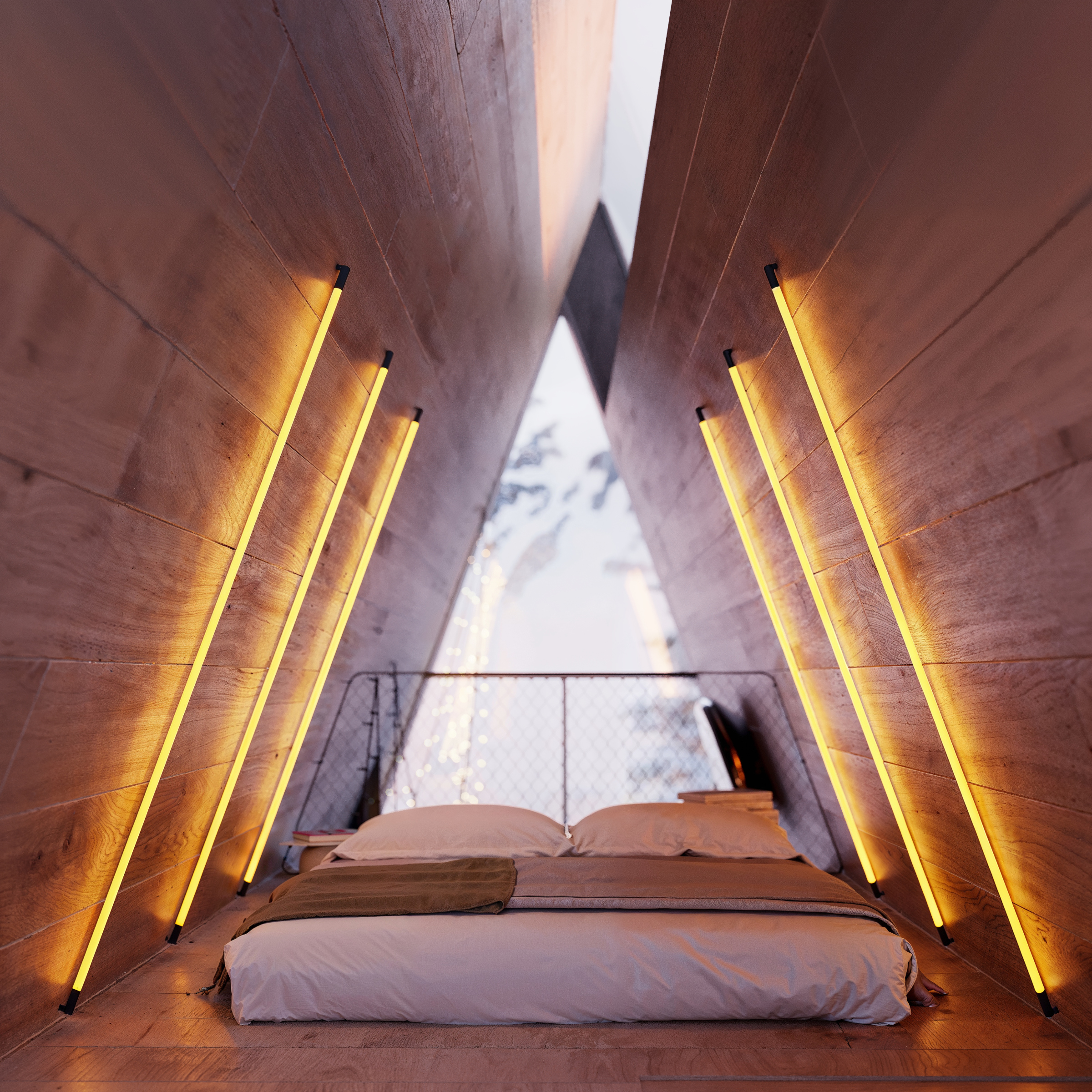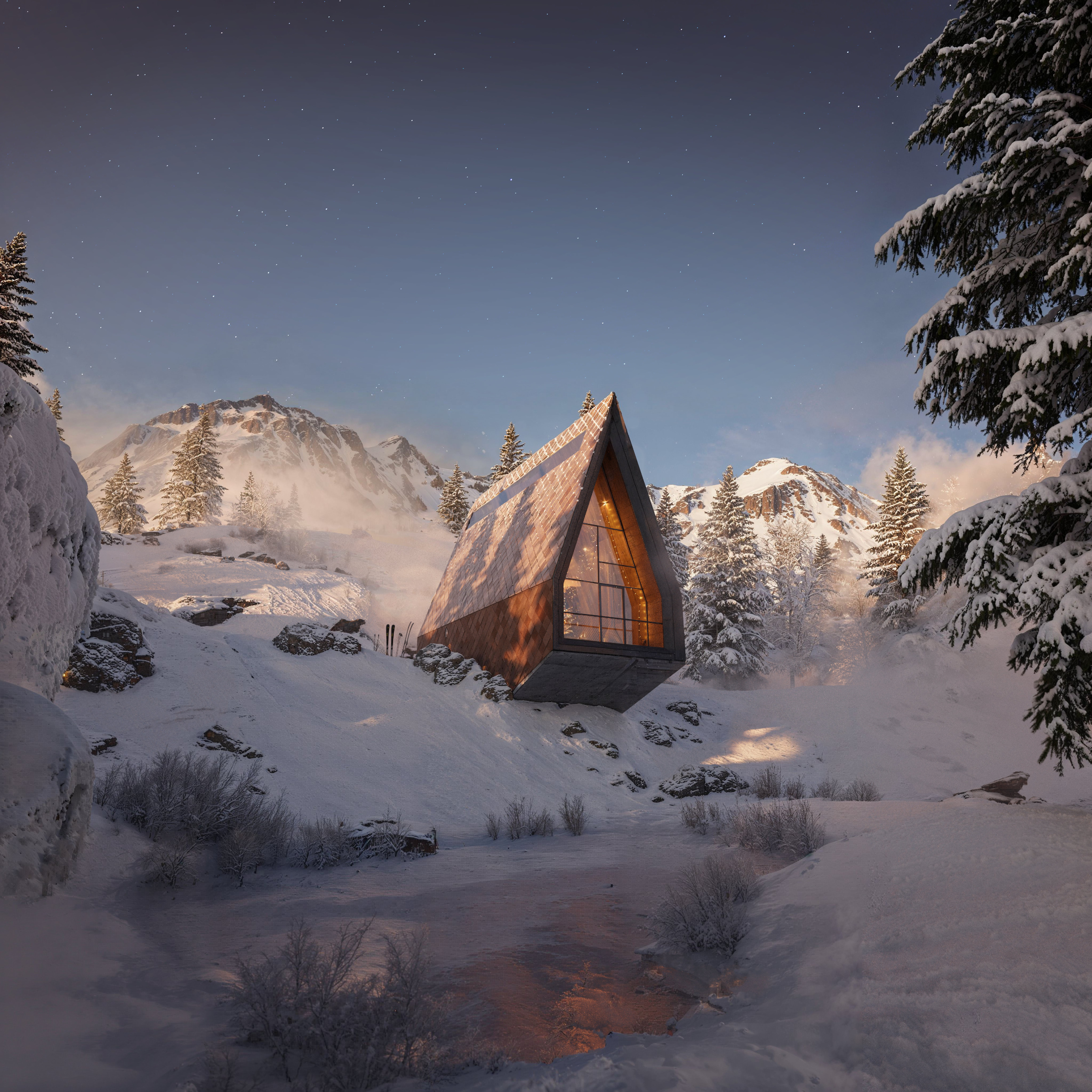 How do you showcase best a technical R&D project? Probably best using an attractive example. For our little Gaussian Splatting adventure the designers at xoio conceived this mountain chalet. The iconic gable roof is minimalistically interpreted and opens a spectacular view to the environment. The result is a fully explorable winter landscape with an interior and an exterior mode:
