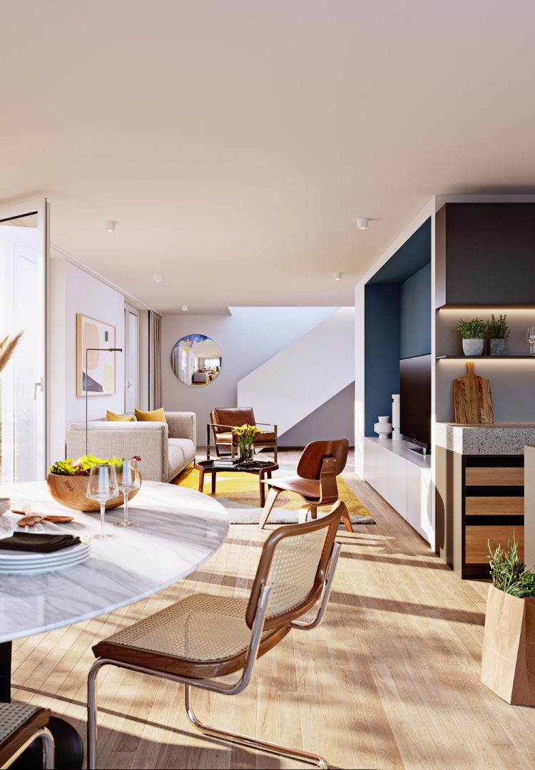 Die Innenvisualisierungen und Detailaufnahmen zeigen eine qualitativ hochwertige Ausstattung. Dem offenen und zeitgenössischen Gesamtkonzept folgend sind die Innenaufnahmen auf verschiedene Zielgruppen ausgerichtet und gestalten sich demzufolge divers. Kleine Apartments, Familienwohnungen und Penthouses bieten ein modernes Zuhause mit großzügigen mit Balkonen, Dachterrassen und Dachgärten. Das erzählen wir mit unseren Bildern.