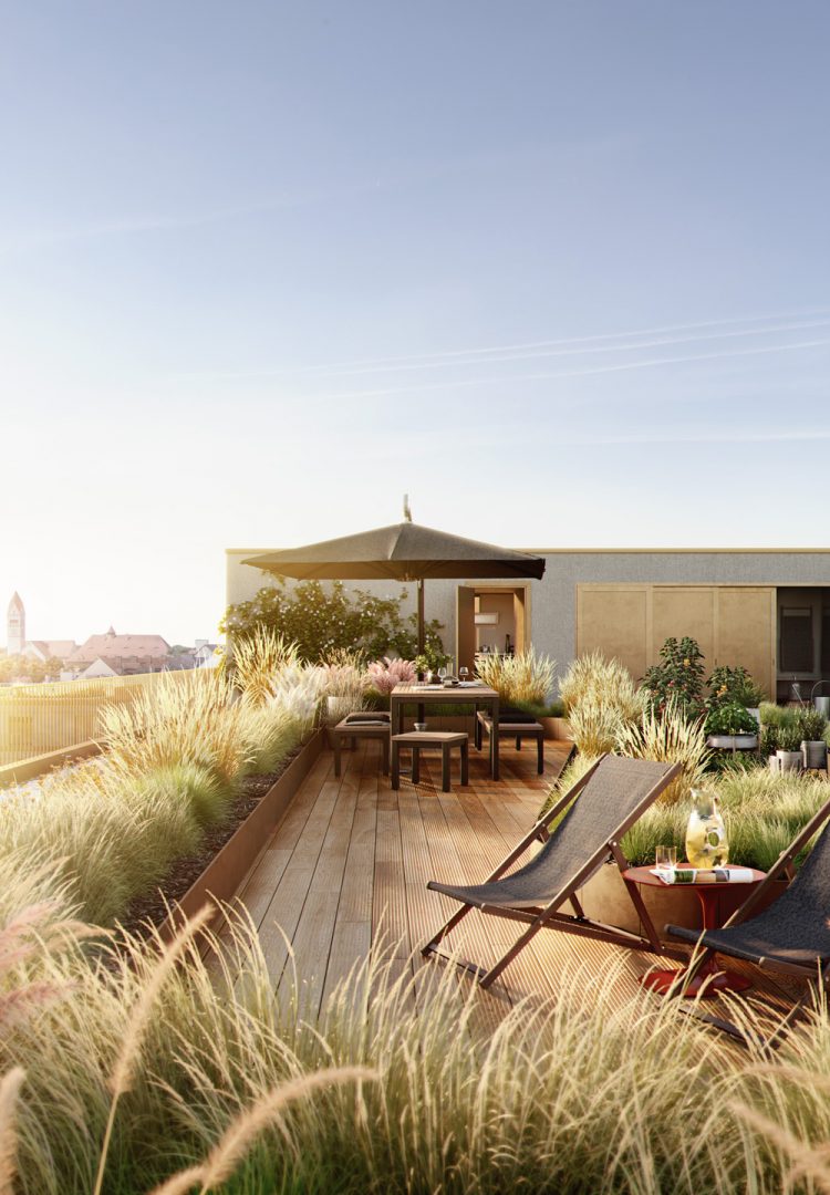 So finden sich in den Aussenvisualisierung Privat- und Gemeinschaftsbereiche mit großzügigen Freiflächen und üppiger Vegetation wieder. Private Rückzugsmöglichkeiten und lebendige Gemeinschaft.