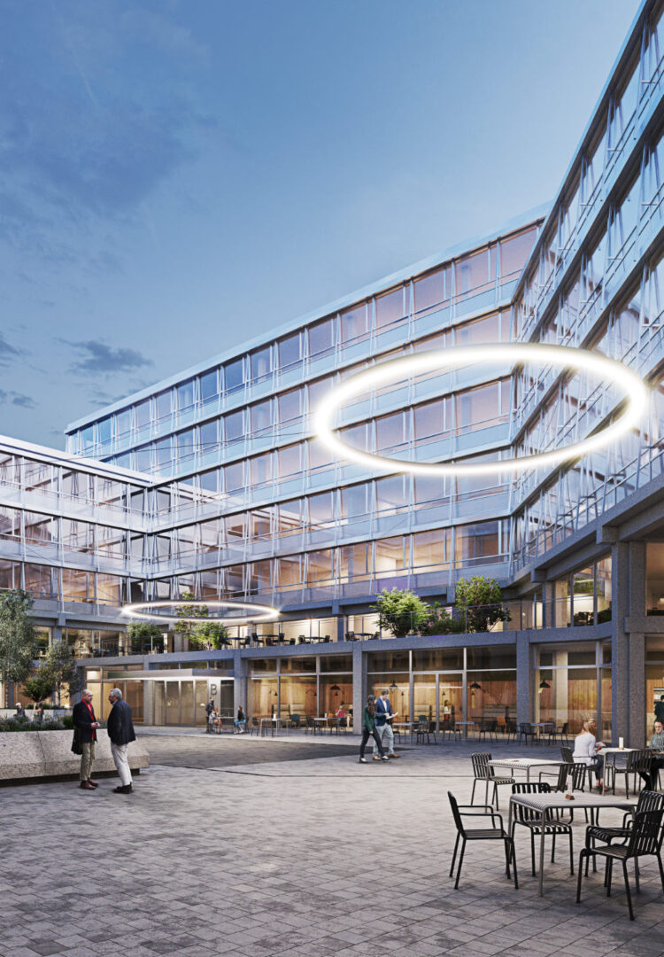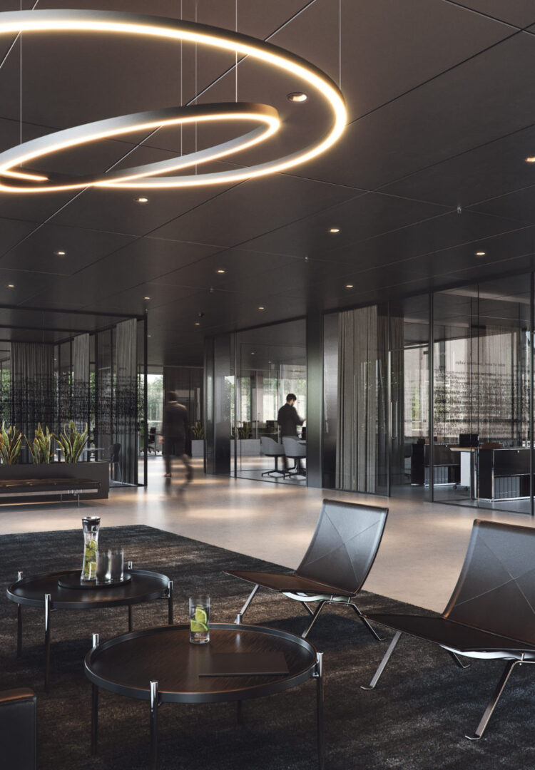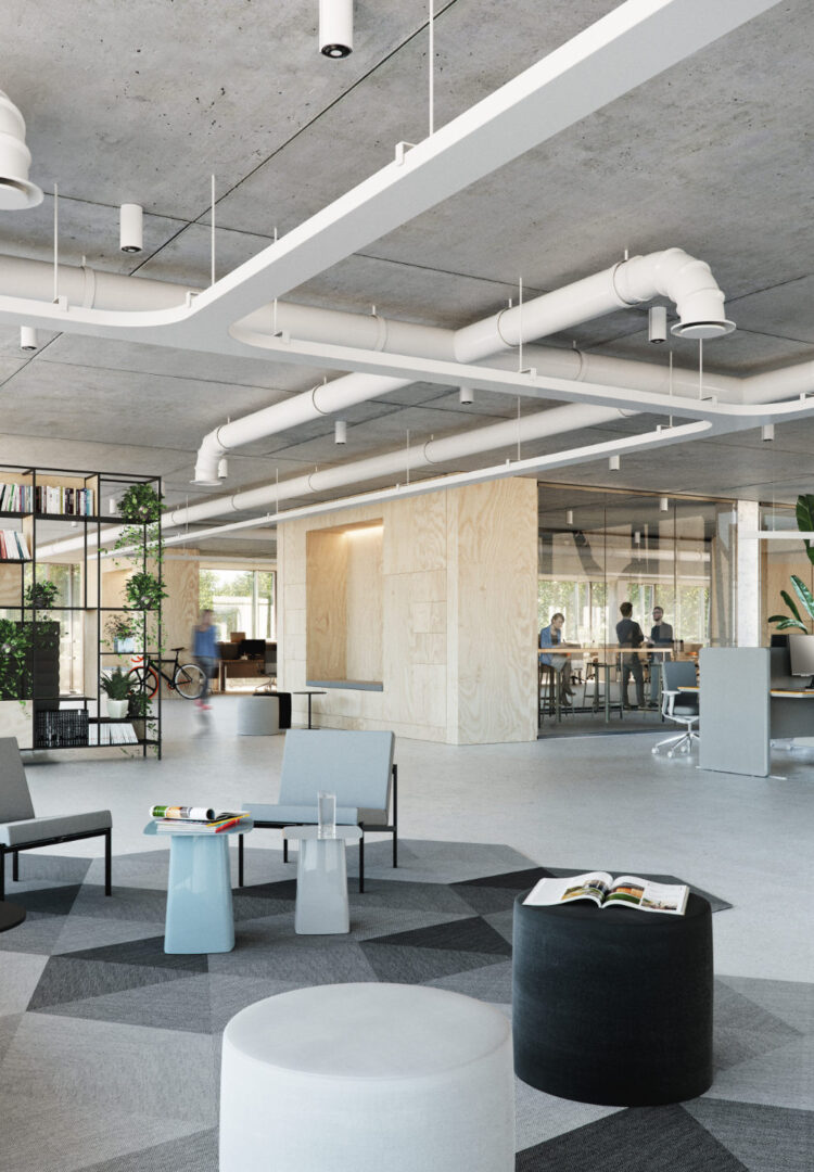 Das architektonische Konzept mit Campus-Charakter sieht eine vielseitige Nutzung der Büroflächen vor – vom Start-Up bis hin zum Großunternehmen. Diese Diversität wird in den Interior Visualisierungen deutlich spürbar.