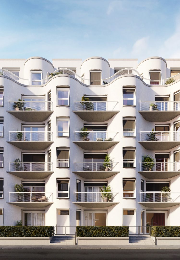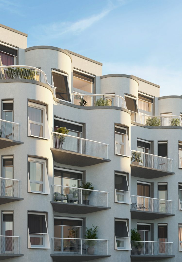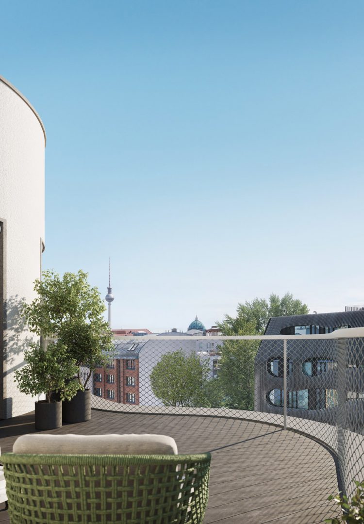 Die geschwungene Fassade von Vert schafft spannende Räume und verleiht dem Bau von Herzog & de Meuron Architekten eine hochwertige und einzigartige Eleganz – im Gesamtesemble von Am Tacheles sticht das Gebäude durch seine ikonische Architektursprache auf jeden Fall heraus.